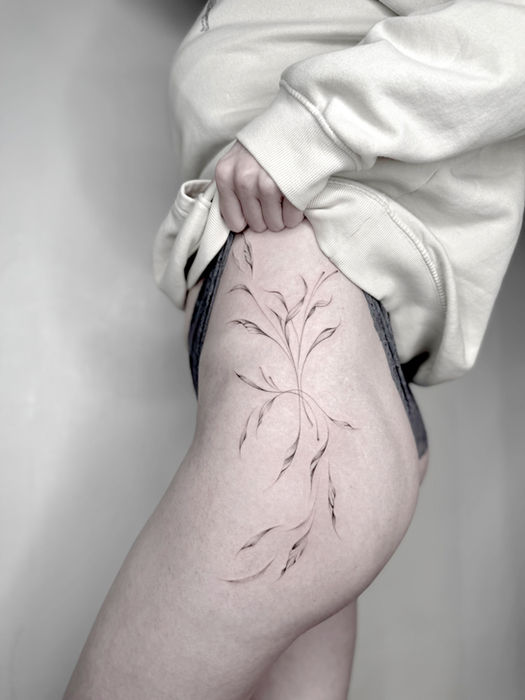 Meine minimalistischen Schriftzüge und kreativen Ornamente setze ich primär mit One-Linern um, wobei ich mich vor allem im Finelinestil durch die Perfektion meiner Linienführung, sowie meiner Liebe zum Detail auszeichne. Viele meiner floralen und linearen Motive entstehen in Zusammenarbeit mit meinen Kundinnen und Kunden, indem ich nach einem gemeinsamen Brainstorming die Designs freihändig an die gegebene Anatomie anpasse.